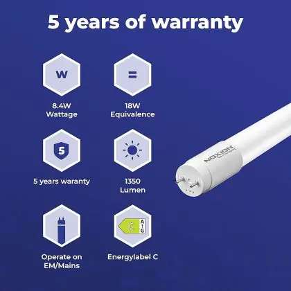 Deze Noxion LED TL buis heeft een Lumen / Watt efficiëntie van lm/W. Dit is de waarde die je verkrijgt door de lichtopbrengst (1350 Lumen) te delen door het wattage (8W) van deze lichtbron. Hoe weet je of jouw lichtbron een goede efficiëntie heeft? In dit geval ligt de lm/W waarde boven de 65. Je kunt er ook voor kiezen om een LED geïntegreerd TL armatuur te kopen. Hierbij heb je de keuze uit diverse (waterdichte) LED montagebalken, die in een divers aantal Lumen verkrijgbaar zijn. Een (dimbaar) LED paneel is ook een slimme optie, met name voor ruimtes met een systeemplafond (eenvoudige installatie) en kantoren (UGR<19 varianten).
